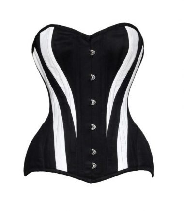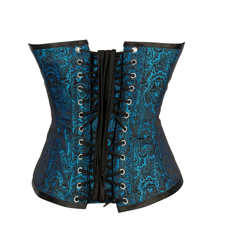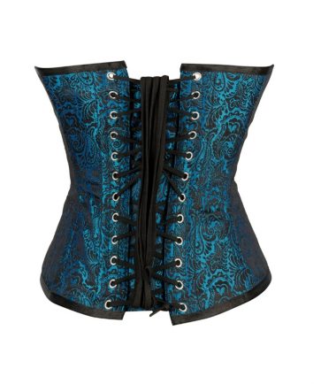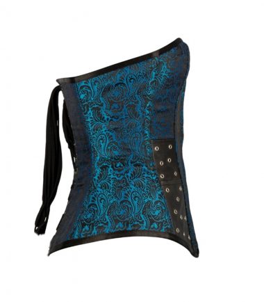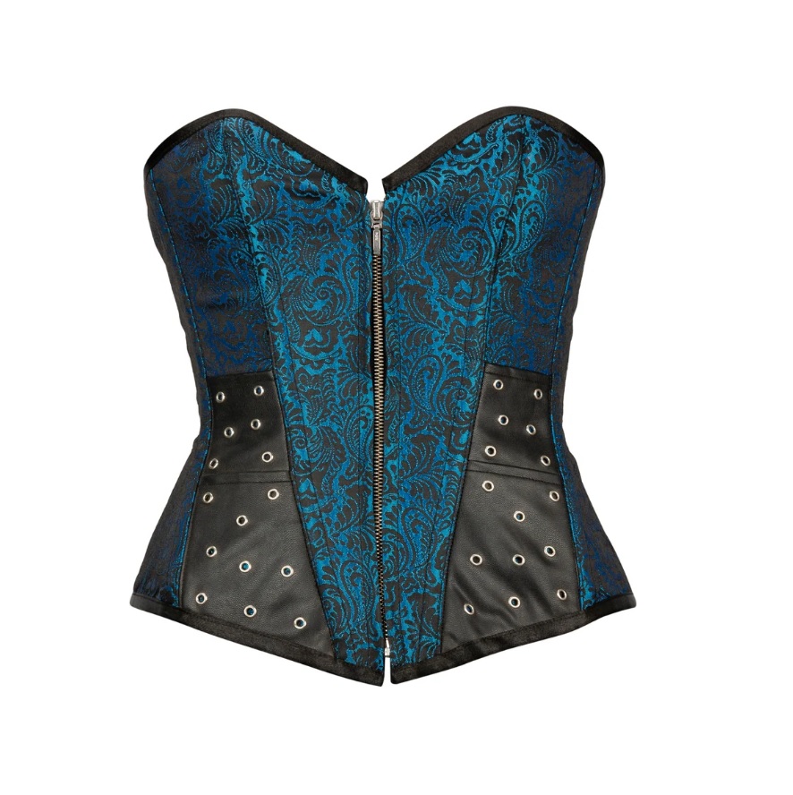 Overbust corset made of Brocade alternative panels of faux leather and lined with cotton and steel bones inside.