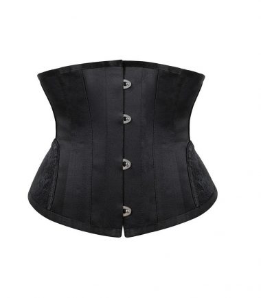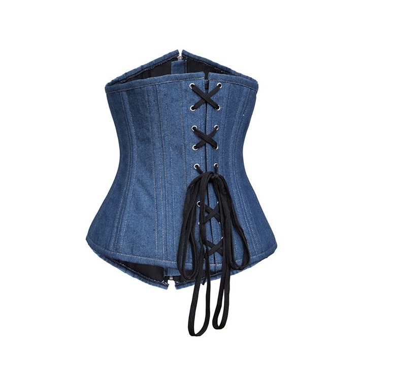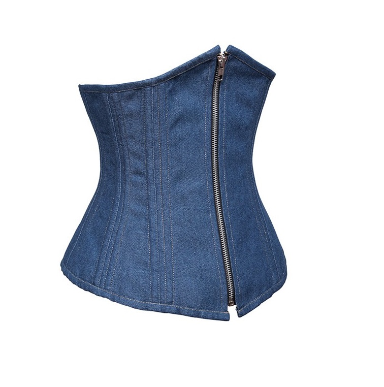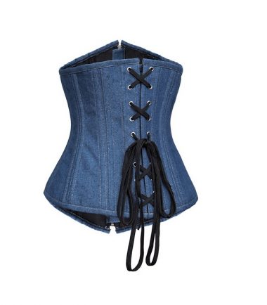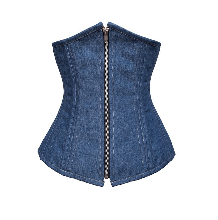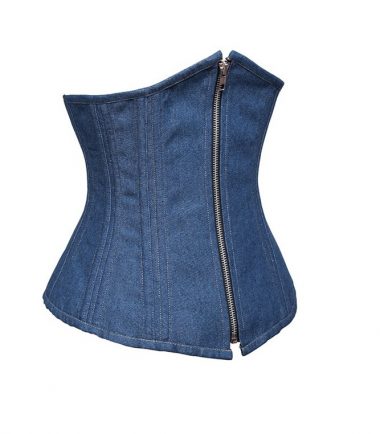 Underbust Corset with front zipper made of blue denim 3 layered lined with cotton and steel bones inside.